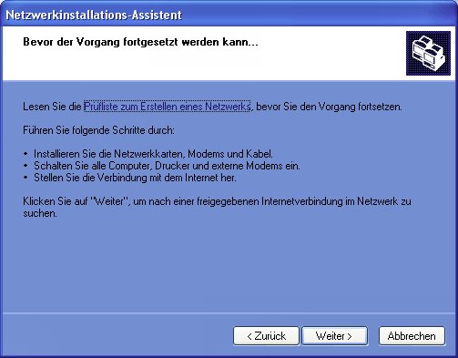 Arbeit mit dem Netzwerkinstallations-Assistenten Starten Sie den Assistenten über den Weg Start / Alle Programme /Zubehör / Kommunikation / Netzwerkinstallations-Assistent. Das Willkommensfenster und die folgende "Prüfauforderung" können Sie getrost sofort mit betätigen der Schaltfläche "Weiter" übergehen.