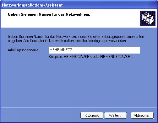 vorgegebenen Namen "MSHEIMNETZ" können Sie beliebig ändern. Das jetzt folgende Dialogfeld dient der Überprüfung der vorgenommenen Einstellungen, die Sie gegebenenfalls über die Schaltfläche "Zurück" nochmals ändern können. Die Bestätigung mit "Weiter" startet die Einrichtung des Netzwerks.